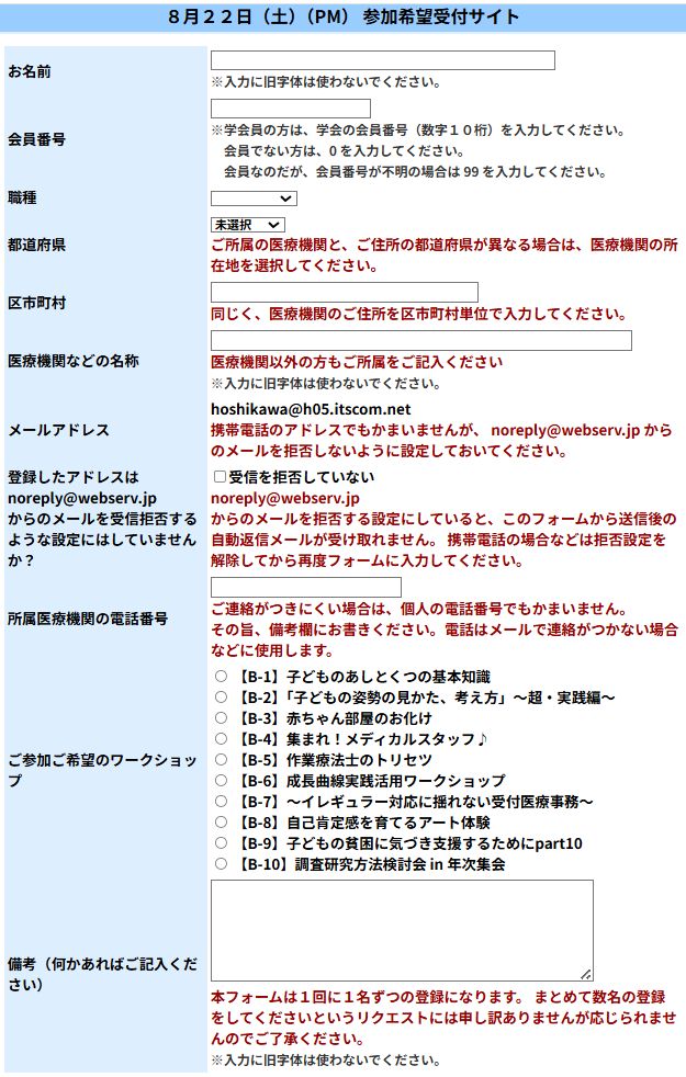 希望する時間帯(例:8月22日(土)PM)を選択すると、以下のように入力画面が表示されます。フォームに入力をしてください。